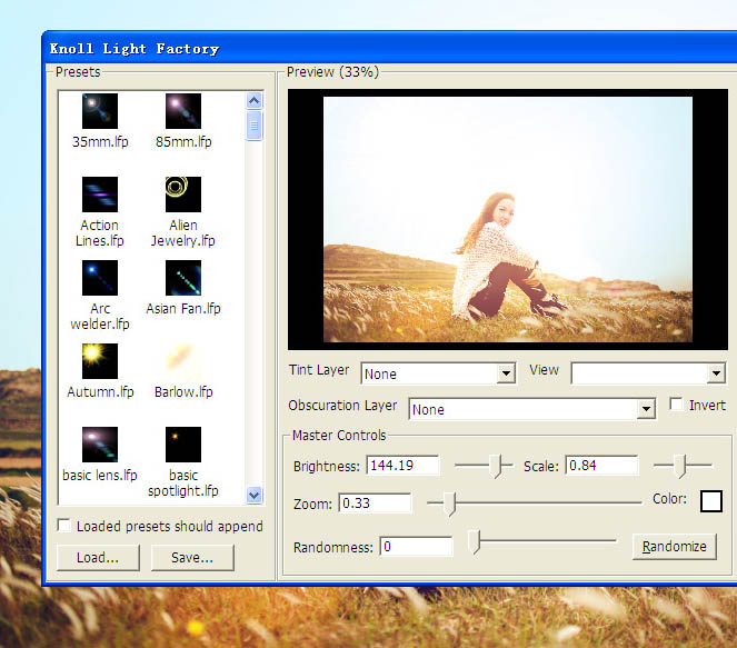 5、做到这里,就要运用到一个灯光工厂,这是个外挂滤镜,可以打造各种光线,这次我选用warm sunflare,可以去网上下载。 |