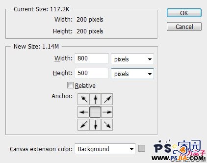 按住Ctrl+alt+c调出画布调整面板,分别把宽度、高度设为800px和500px。