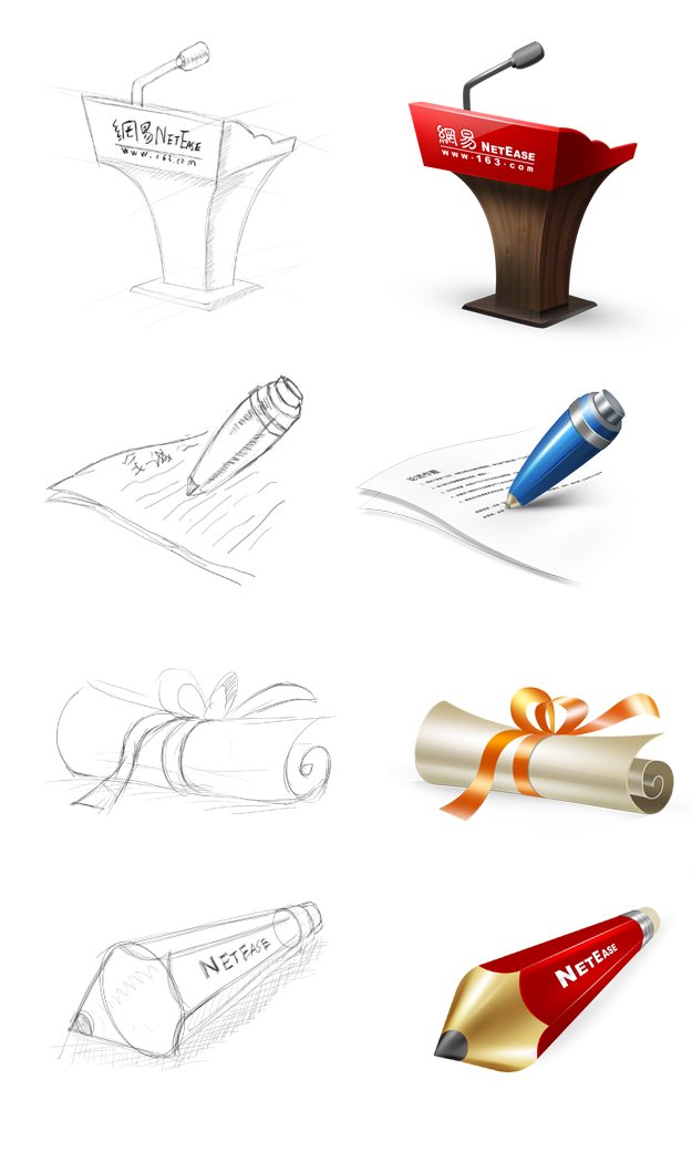图标设计,很多人都有自己的一套方法。这里我跟大家分享一下自己的一些小经验。先来看几个线稿与最终效果图: