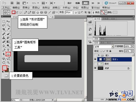 2、选择“圆角矩形工具”,在打开的工具选项栏中选择“形状图层”按钮,创建“形状 1”图层。 |