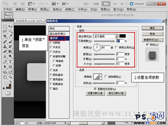 3、为“形状 1”图层添加图层样式,单击“投影”项目,并设置其各项参数。 |