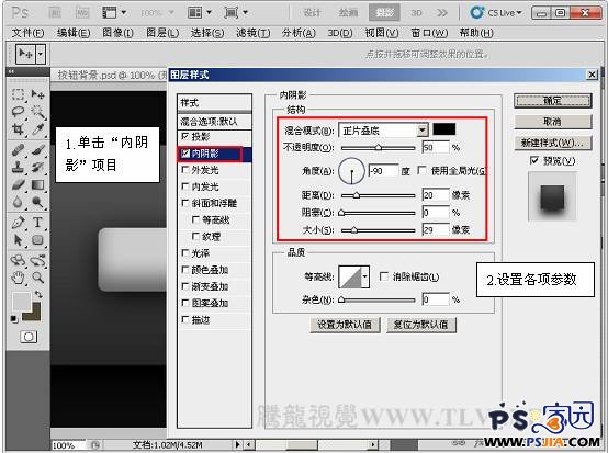 | 4、单击“内阴影”项目,并设置其各项参数。 |