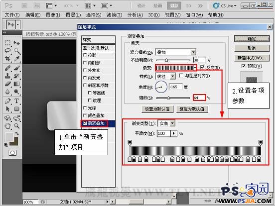 | 10、为“形状 1”图层添加“渐变叠加”图层样式,并设置其各项参数。 |