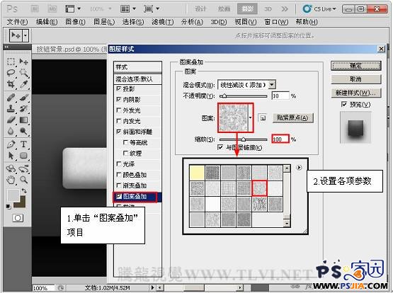 | 6、单击“图案叠加”项目,并设置其各项参数。 |