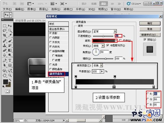 | 15、单击“渐变叠加”项目,并设置其各项参数。 |