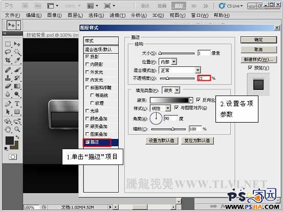 15、单击渐变叠加项目,并设置其各项参数。 16、单击描边项目,并设置其各项参数。 17、按下确定按钮,关闭图层样式对话框,设置填充参数,效果如图