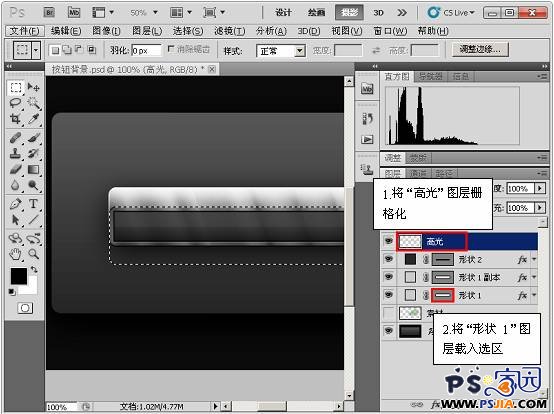 | 19、将“高光”图层栅格化,按下<Ctrl>键的同时单击“形状 1”图层,将其载入选区,移动选区位置,对“高光”图层进行修整。 |