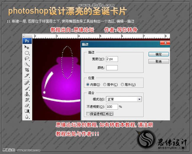 11、新建一个图层,图层位于球面层之下,使用椭圆选框工具绘制出一个选区,然后选择菜单:编辑 > 描边,参数设置如下图。