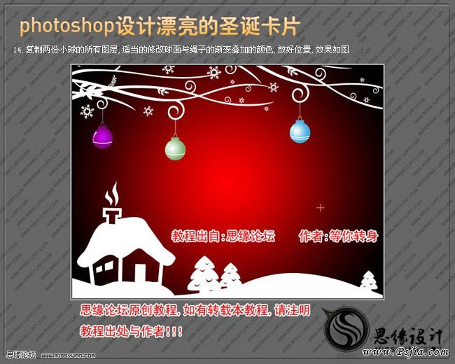 14、复制两份小球的所有图层,适当的修改球面与绳子的渐变叠加的颜色,放好位置,效果如下图。