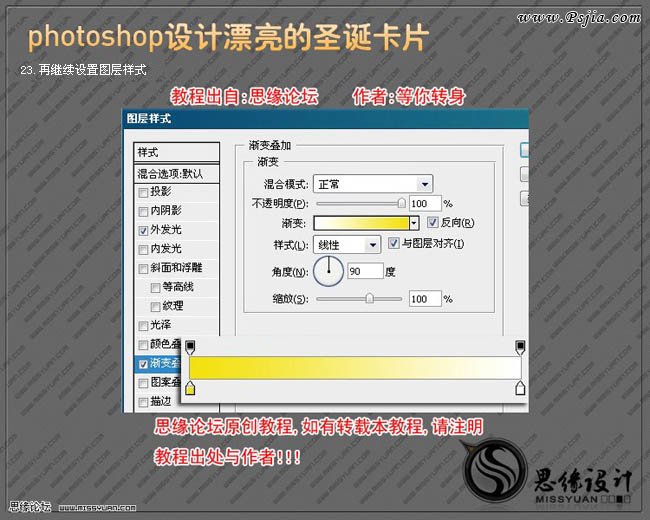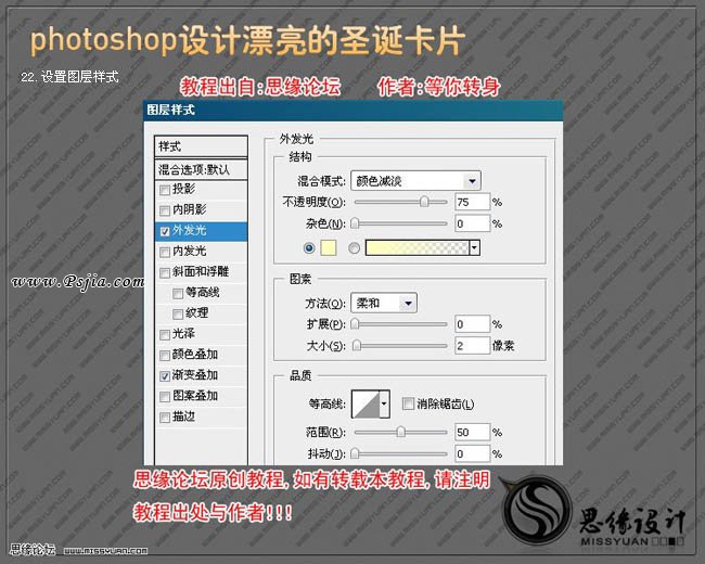 22、设置图层样式,选择外发光。 23、再继续设置图层样式,选择渐变叠加,颜色设置如下图。 24、复制一层,适当缩小,放好位置,用类似的方法完成下