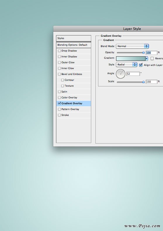 用径向渐变填充背景。为了做到这一点,右键单击背景图层(在图层窗口中)并选择“混合选项”。 在这里添加一个蔚蓝色(#ddf3f3)到深蓝色(#8ab4b4)的渐变。