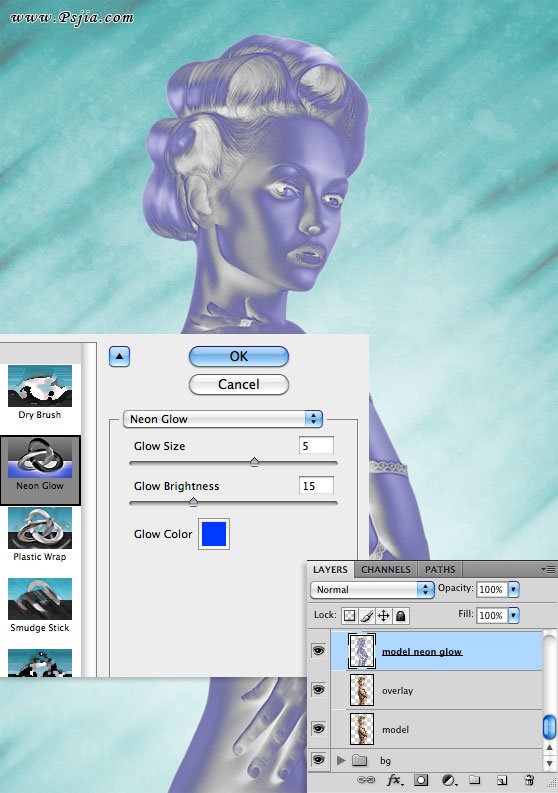 选择创建的最后一层,去滤镜>艺术效果>霓虹灯光,输入“发光大小”为5,“发光亮度”为15。点击OK应用滤镜。
