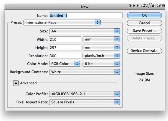 在Photoshop中创建一个新的A4文件。我们将使用大一点的图像,这样可以完美的处理细节。