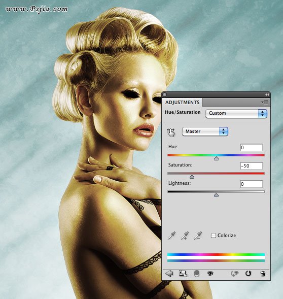 是时候添加一些重要的颜色调整了。让我们减少饱和度。去图层>新建调整图层>色相/饱和度,降低饱和度为-50