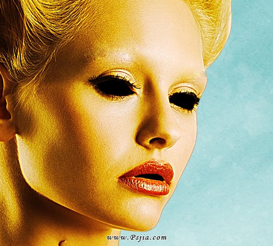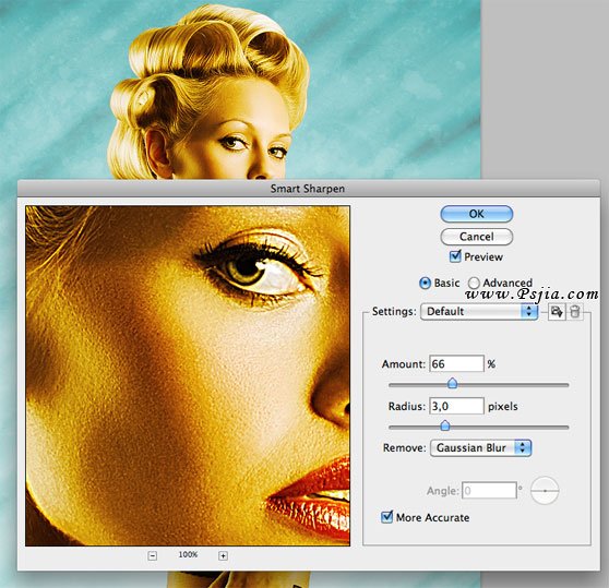 这位女士有强烈的黄色,但她看起来并不像被黄金覆盖。之后下载一些黄金描绘的模特图片(这是一个伟大的工作!),增强皮肤的小细节。因此,在Photoshop中,去滤镜>锐化>智能锐化,应用以下设置: