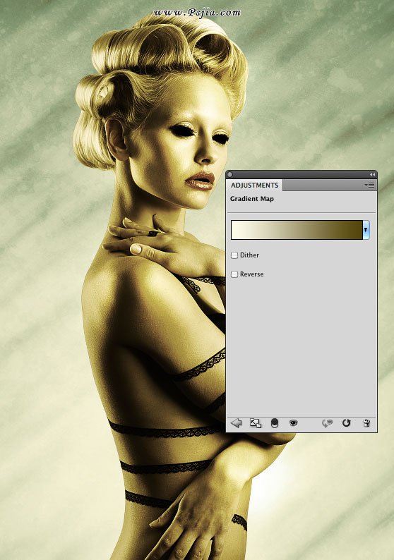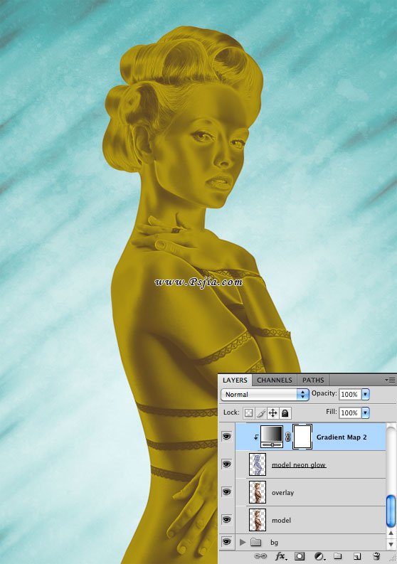 去图层>新建调整图层>渐变,并添加一个黄色(#ffe400)到棕色(#503823)的渐变。我们希望颜色调整只应用到“灯光模特”图层上。要做到这一点,按住ALT键在渐变和“霓虹灯光模特”图层之间点击。通过这种方式创建剪贴蒙版(渐变层附近会出现一个小箭头),这意味着上面图层的所有效果只会影响到其下方覆盖的区域。