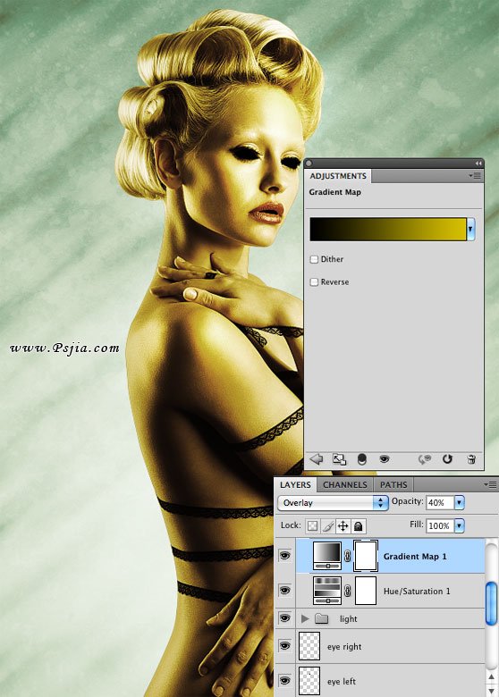 添加由黑色到黄色(#d7c000)的渐变图层。设置图层为叠加,不透明度40%。