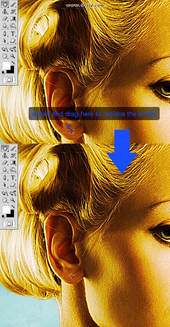 我想令模特超现实一点。放大她,使用修补工具,选择耳垂上的洞,并拖动选区到你想要用来替换的第一个选区的区域上(这句话真绕嘴,其实很简单)。