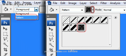 创建好之后,点击”编辑>定义图案”,保存自定义的填充图案。然后回到第一个文档里,按住CTRL在图层的缩略图上单击,创建选区。新创建一个图层,取名为“样式”。选择油漆桶工具,填充方式里,选择图案,图案选择我们刚才创建的那个图案。