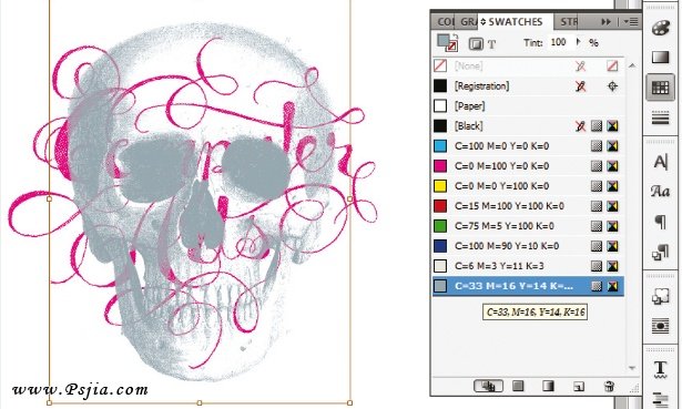10 最后我在骷髅的头上嵌入了一把神秘的剑,恩,这样更有海报的感觉了。背景上用了些半吊图案,就像我们之前做的那样,也设置成正片叠底。当然,在你打印前,你需要再次确认下,图片颜色的正确。如果有需要,你可以再边缘加入出血效果。