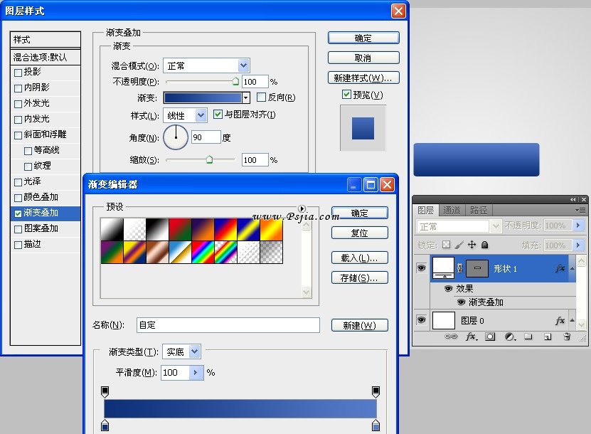 添加渐变叠加图层样式。渐变颜色从#0d3079到#557bc9。