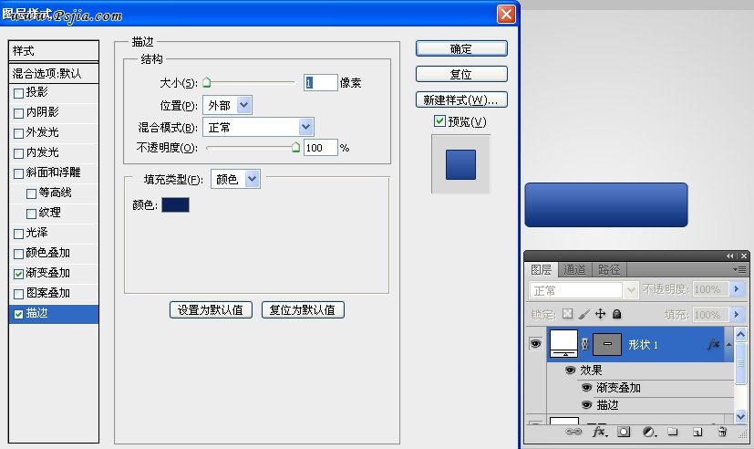 现在让按钮从背景中突显出来,添加1 px描边,颜色为深蓝色(#0b2258)。