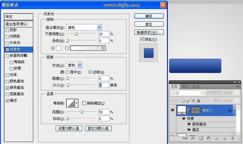 为了增加按钮立体感,添加一个1像素内发光。颜色为白色(#FFFFFF),减少不透明度到30%。