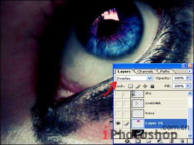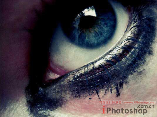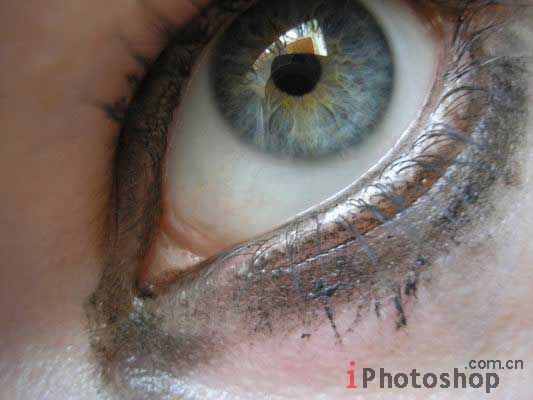 层类型设置为叠加。选择一款现成笔刷,模仿大理石纹理将图片覆盖,并剪切掉眼睛所在的部分,如下: