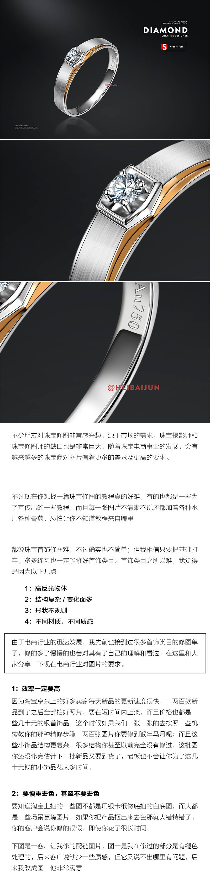 不少朋友对珠宝修图非常感兴趣,源于市场的需求,珠宝摄影师和珠宝修图师的缺口也是非常巨大,随着珠宝电商事业的发展,会有越来越多的珠宝商对图片有着更多的需求及更高的要求不过现在你想找一篇珠宝修图的教程真的好难,有的也都是一些为了宣传出的一些教程。而且每一张图片不清晰不说还都加着各种水印各种膏药,恐怕让你不知道教程来自哪里都说珠宝首饰修图难,不过确实也不简单;但我相信只要把基础打牢,多多练习也一定能修好首饰类目。首饰类目之所以难。