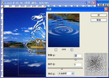 8、在背景副本图层上拉出一个矩形选框,执行滤镜—扭曲—水波,数量60,起伏8,样式为水池波纹。