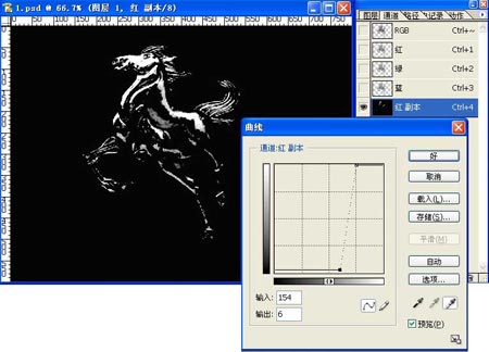 4、复制图层1的红色通道,再回到图层面板,按住CTRL键点击图层1,得到选区后再回到红色通道副本,反选—填充黑色,取消选择。调整曲线如图所示。然后将通道作为选区载入。