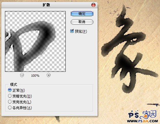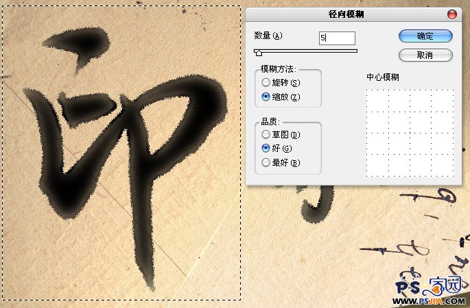 拉出一个矩形选区,选取一个文字,执行“径向模糊”滤镜,形成墨迹融开的效果。