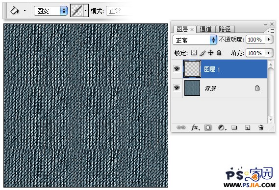 回到“牛仔质感”文件,新建“图层1”,图案填充画布。