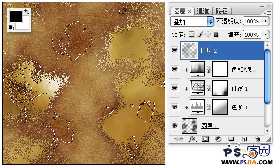 载入Alpha2通道的选区,新建“图层3”,黑色填充选区,把图层混合模式更改为“叠加”,作为金属凹陷斑点的形状。