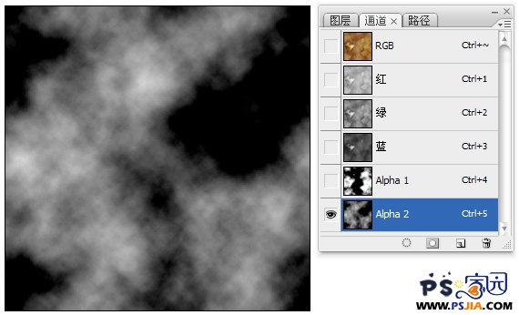 新建Alpha2通道,执行“分层云彩”滤镜。