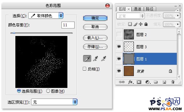 回到背景图层,执行通过拷贝的图层命令。 继续对图层1执行色彩范围命令,吸取不同与上次的部分颜色范围作为选区。 回到背景图层,继续执行通过拷贝