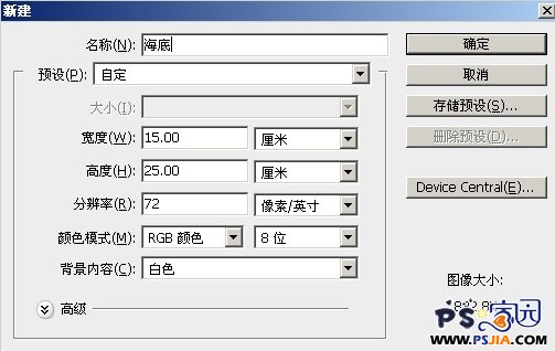 1:打开PHOTOSHOP CS3 ,选择文件/新建命令或【Ctrl+N】,在弹出的对话框中设置文件名称和大小。 2:绘制海水的颜色――选择工具面板上的渐变工具,按住SHIFT键在画布上画出从上至下的渐