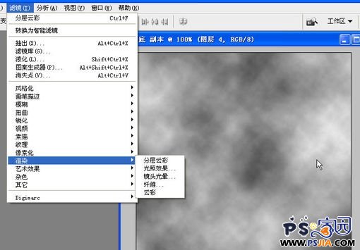 4:将前景色和背景色设置为黑白,填充前景色,并选择【滤镜】→→【渲染】→→【分层云彩】命令,在图层上出现了黑白云彩的效果
