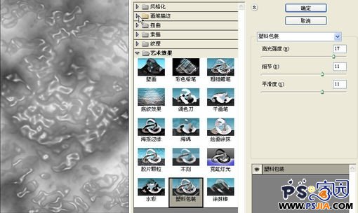 5:选择【滤镜】/【滤镜库】命令。并在弹出的滤镜库对话框中设置参数。选择【艺术效果滤镜】中的【塑料包装效果滤镜】。并设置参数