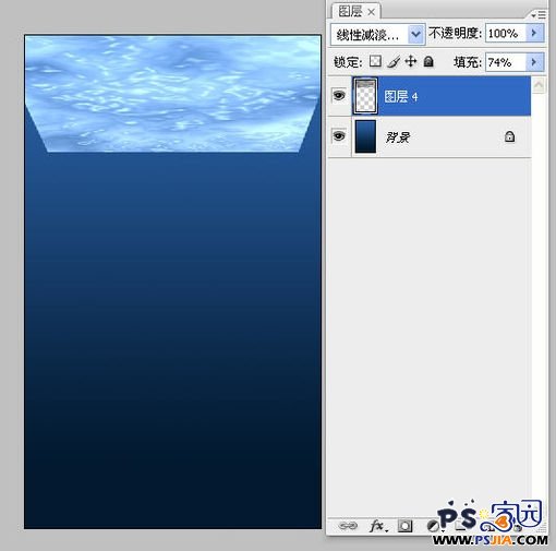 7:选择图层1,并将图层的混合模式设置为【线性减淡添加】。设置填充为74%,现在可以看到海平面基本出现,并且还有透光的感觉。