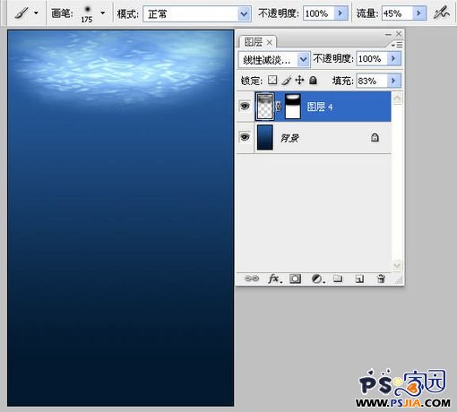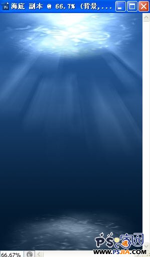 2:绘制海水的颜色――选择工具面板上的渐变工具,按住SHIFT键在画布上画出从上至下的渐变。这样海底的颜色就绘制好了。