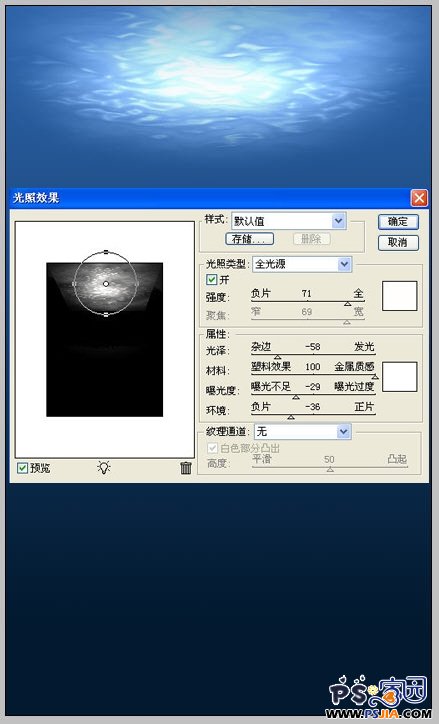 9:为海平面添加光的效果,选择图层1,选择【滤镜】→→【渲染】→→【光照效果】命令。在弹出的光照效果对话框中设置参数如图。将灯光放置在合适的位置,并设置光的强度、类型和属性。