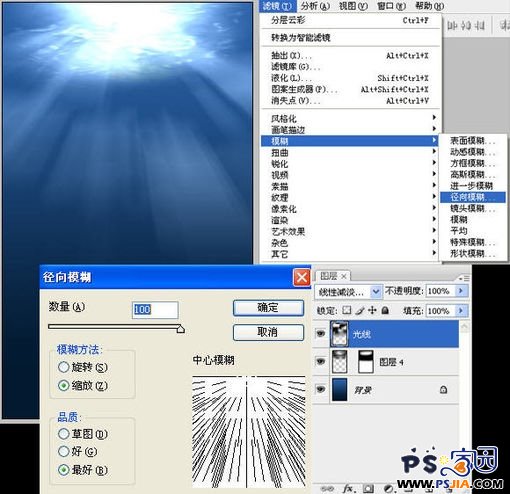 11:在菜单栏中选择【滤镜】→→【模糊】→→【径向模糊】命令,在弹出的对话框中设置数量为100,模糊方法为缩放,品质为最好。设置中心模糊的位置为上方。并设置图层叠加模式为线性减淡添加,(如图11)所示。按下【CTRL+t】键,将光线的图层位置调整一下。现在可以看到光效了,就像阳光射到海底。