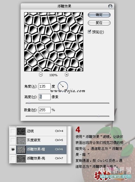 4、把当前通道复制一层,命名为“浮雕效果-暗”,执行:滤镜 > 风格化 > 浮雕效果,参数设置如下图。确定后把得到的通道再复制一层,命名为“浮雕效果-亮”,按Ctrl + I 反相。