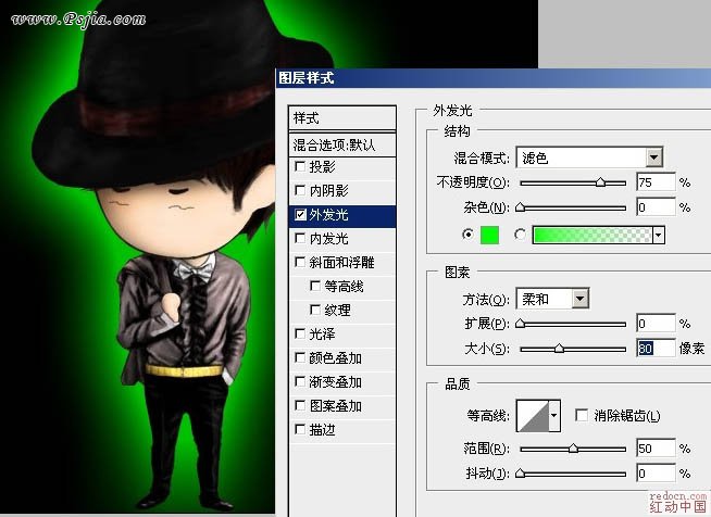 5、参数如下,大小可以自行设置,看大家喜好吧我喜欢大些。 6、设置好外发光后,在所有图层上面新建一个图层,并加上云彩效果(加上云彩时记得把前