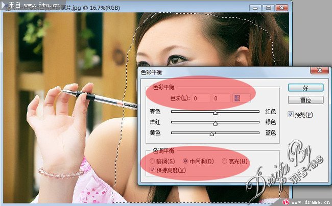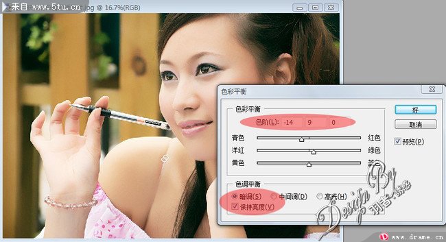 8、按Ctrl+B调整色彩平衡(选中心调、连结亮度、色阶0、0、-8)