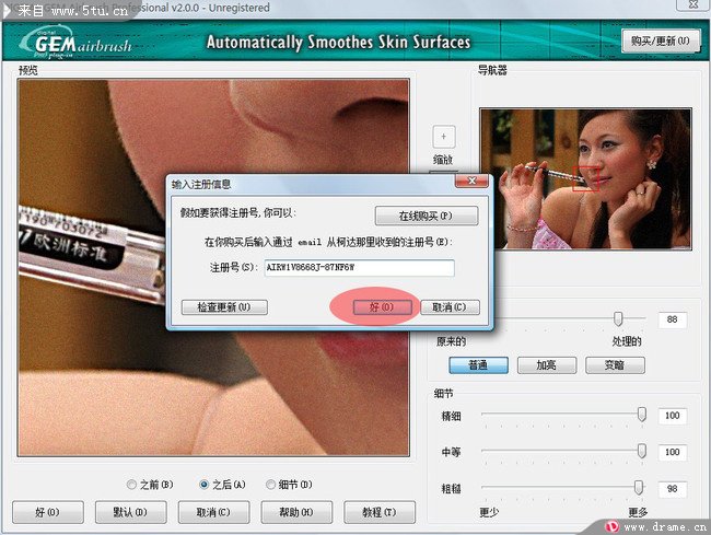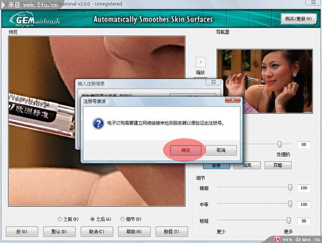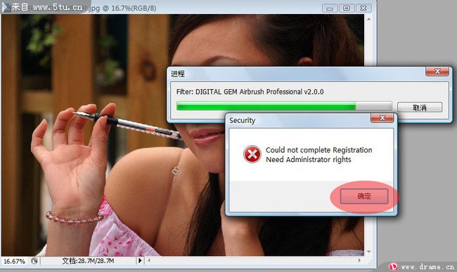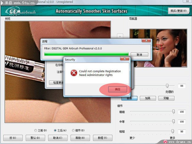 (PS:大师可以去这里:下载柯达磨皮滤镜,有些版本是有自带的注册码,如果没有注册码,我在这里供给注册码给大师,注册码:AIRW1V8668J-87NF6W,利用的时会弹犯错误的提醒,但不用管,点确定就好了,请看以下的提醒: