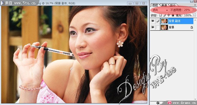2、再复制一层,并将同化模式改为滤色,设置透明度为29%,Ctrl+E合并图层