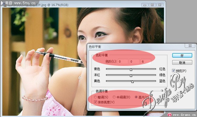 6、按Ctrl+B调整色彩平衡(选高光、连结亮度、色阶0、0、6)