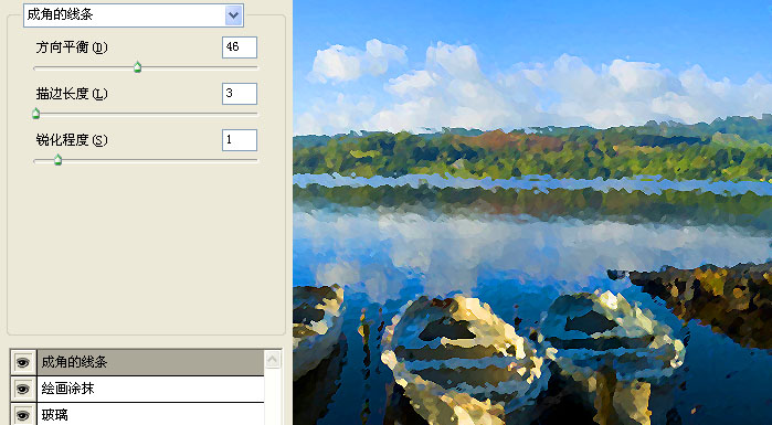 步骤 5、同理,新建效果图层,选择“画笔描边 >> 成角线条”滤镜。
